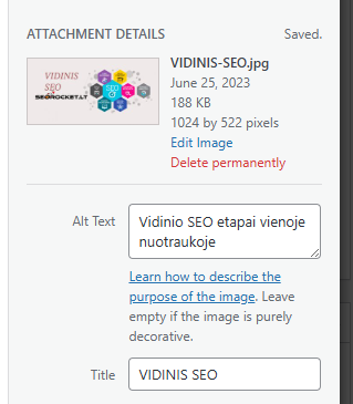 Vaizdai padeda pritraukti lankytojus per vaizdų paiešką ir pagerina bendrą naudotojo patirtį. Norėdami pasiekti geriausią rezultatą, pradėkite nuo alternatyvaus teksto (alt tekstų) kūrimo – jie paaiškina vaizdo turinį tiek paieškos sistemoms, tiek ekrano skaitytuvų naudotojams. Pavyzdys:Alt tekstas: „Vidinio SEO etapai vienoje nuotraukoje”